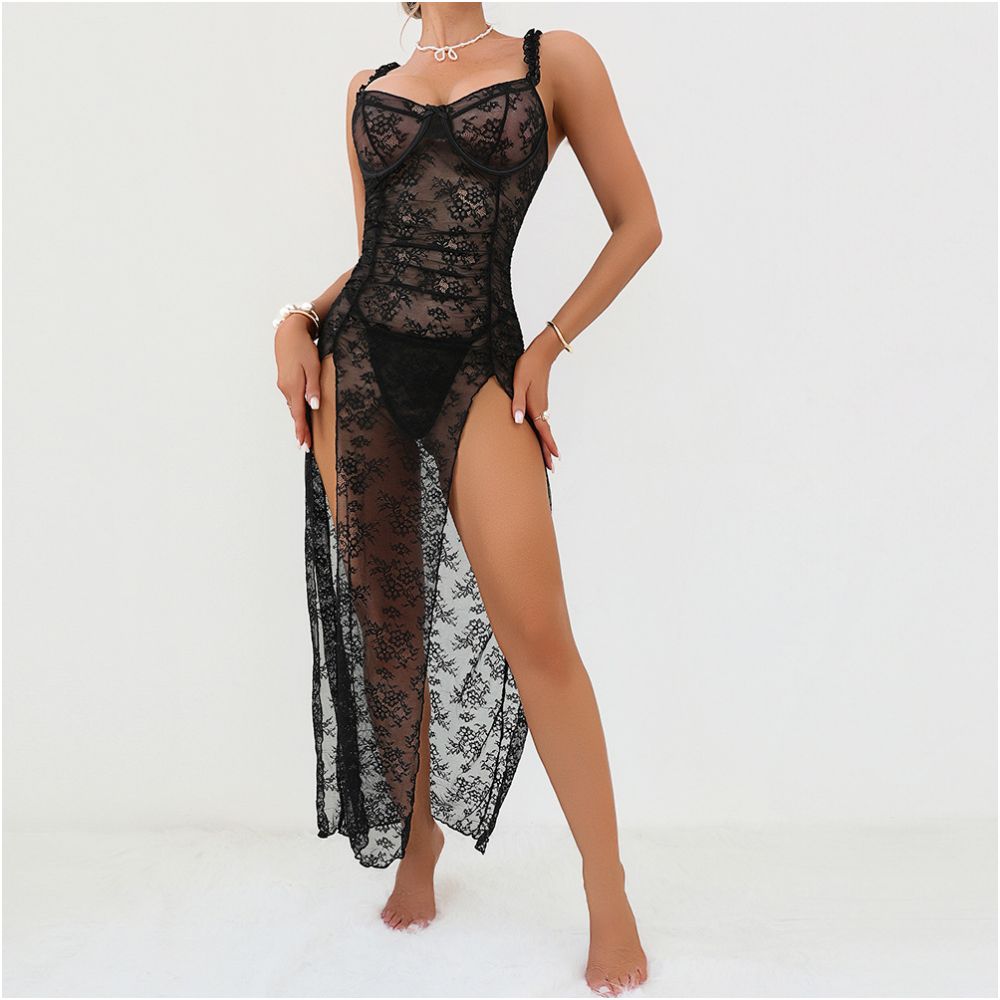 n heads with this stunning black lace see-through maxi dress, designed to highlight your curves with elegance and confidence. Featuring delicate spaghetti straps, a flattering bodycon fit, and a bold high slit, this dress is perfect for nights when you want to feel irresistible.