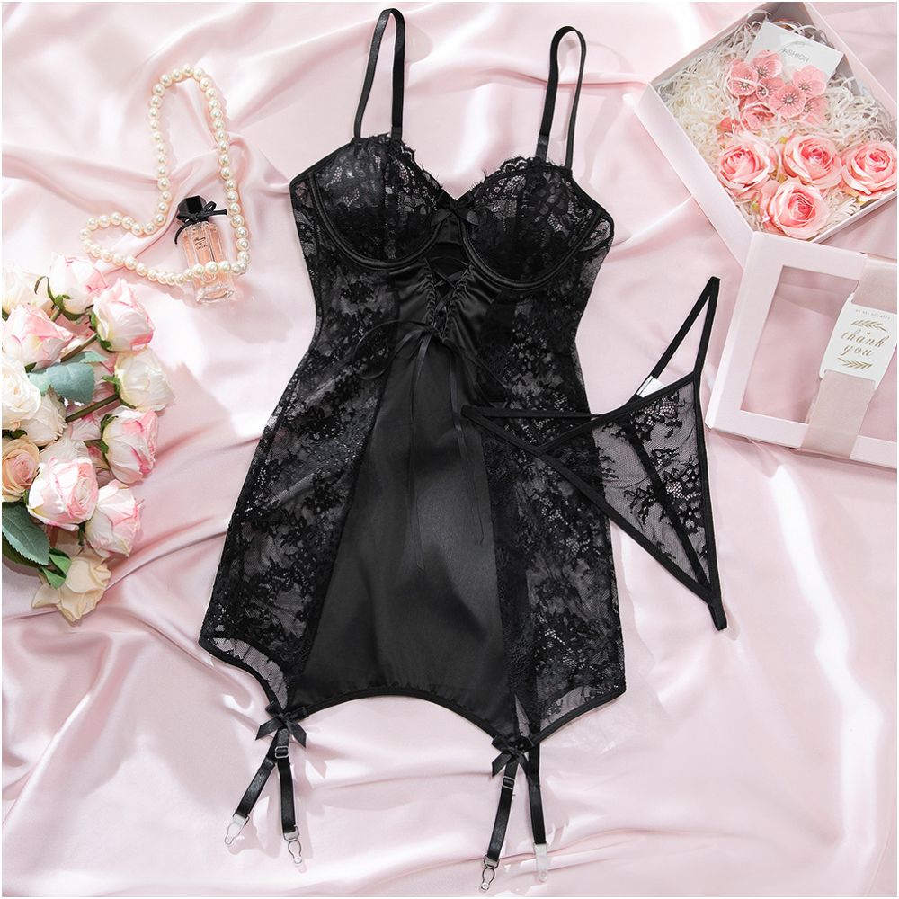 The corset-style front detailing subtly draws the eye inward, creating a naturally contoured shape without feeling restrictive. Finished with adjustable garter straps, this piece transitions effortlessly from intimate evenings to elevated lingerie styling.