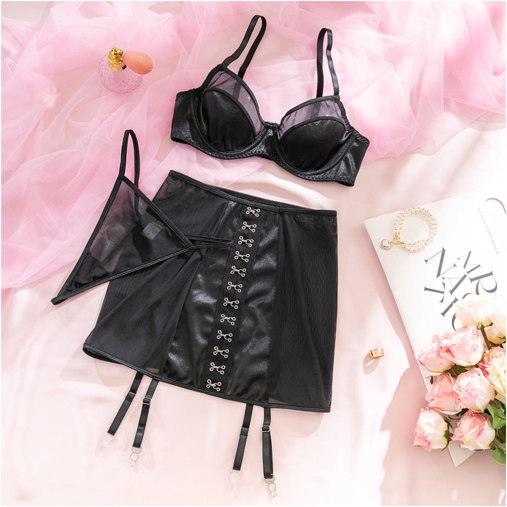The standout piece is the high-waist mesh garter skirt, featuring a structured front panel with decorative hook detailing that enhances the waistline and elongates the silhouette. Lightweight, breathable, and beautifully fitted, this set is perfect for those who prefer a confident yet understated sexy style.