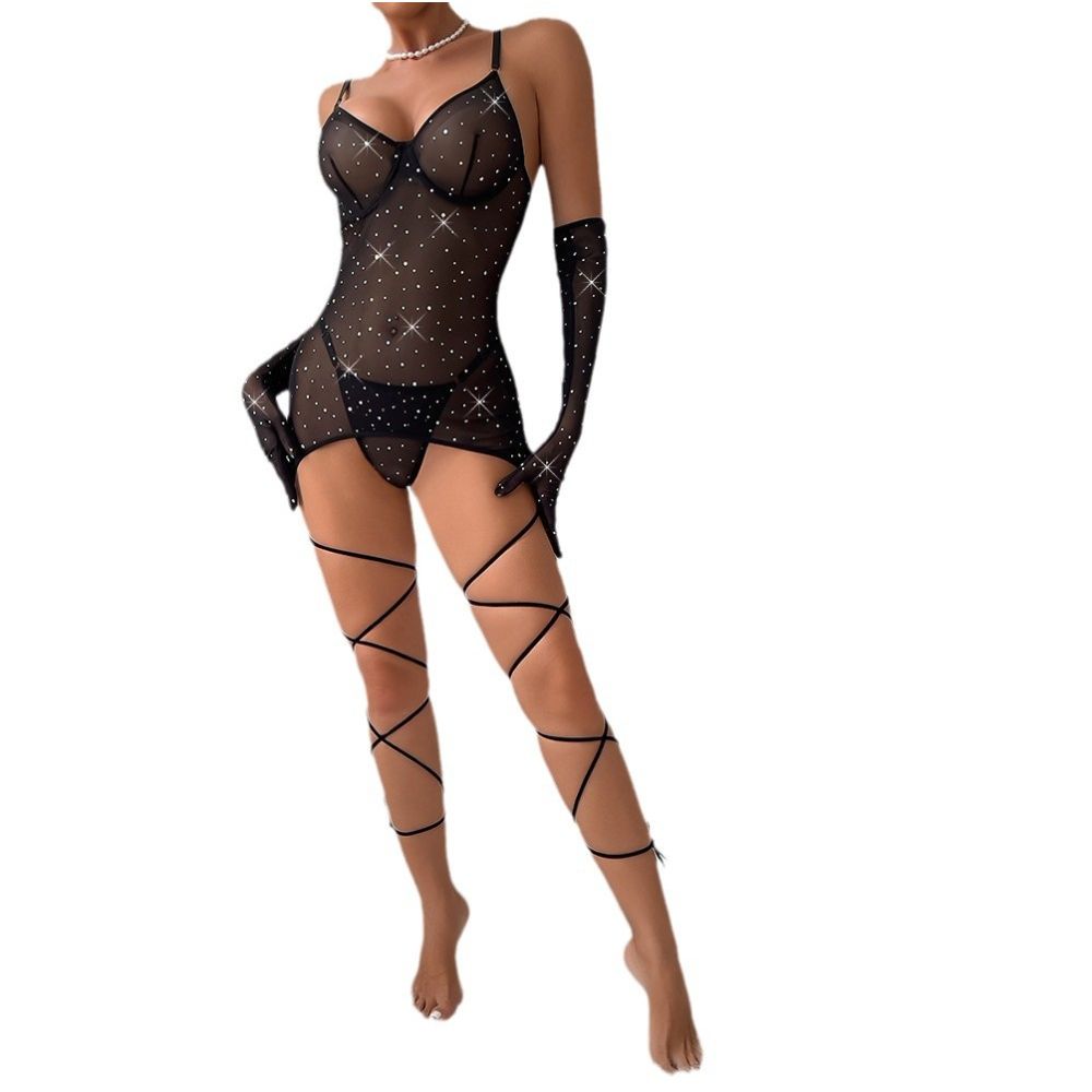 The fitted silhouette hugs the body, while the matching sheer gloves and wrap-style leg straps add a dramatic, high-fashion finish. Lightweight and fluid, this piece feels sensual without being heavy—perfect for statement nights and unforgettable moments.